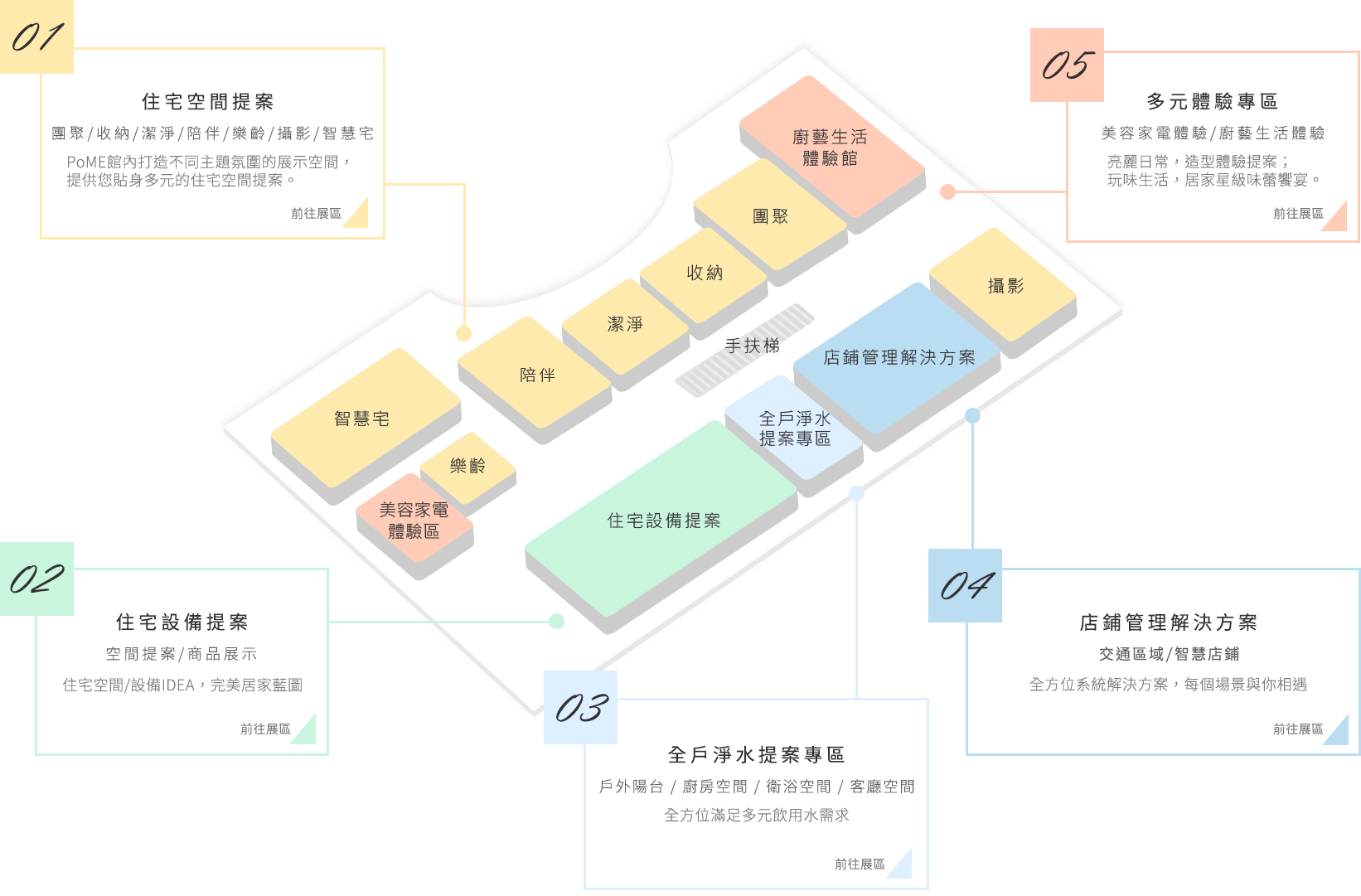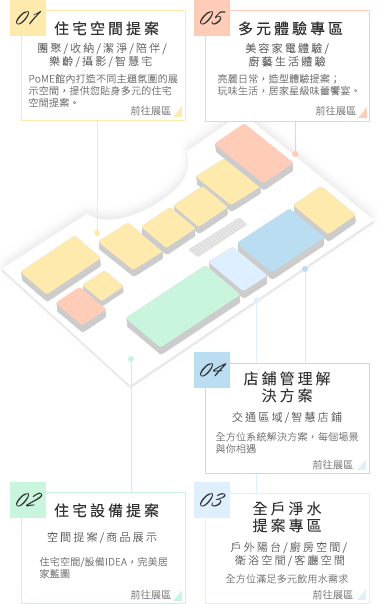 PoME館內打造不同主題氛圍的展示空間,提供您貼身多元的住宅空間提案。同時,也能找到您的未來生活空間。讓您充分感受住宅、交通及不同公共領域中,讓您超乎想像的Panasonic!