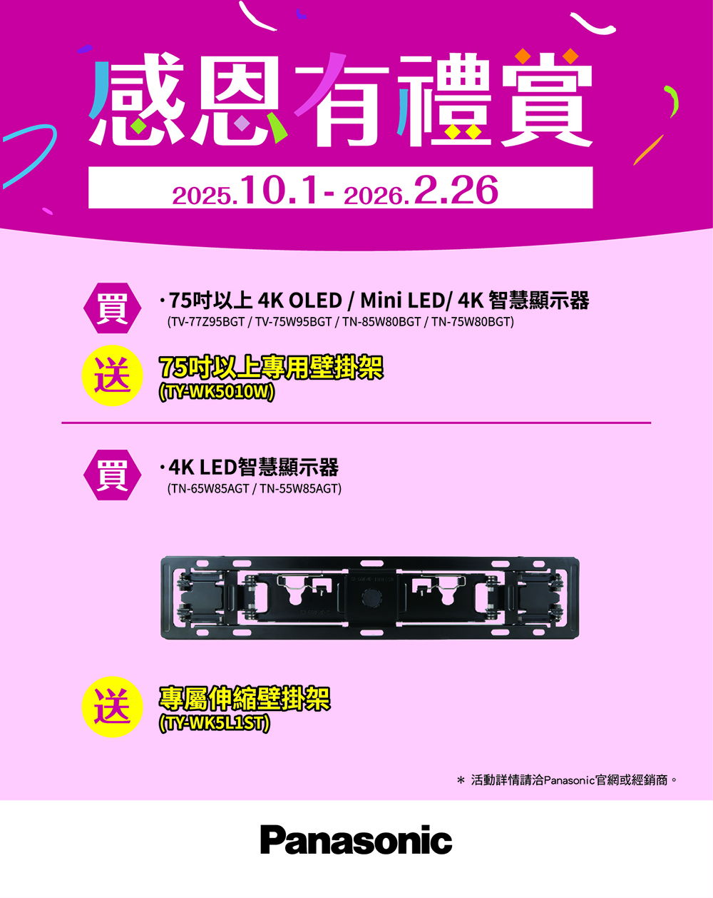 1. 放入購物車本站提供完整的網路購物環境為您服務,當您已選定商品時,請置入購物車。此時會顯示您的購物清單。2. 購買內容確認點選結帳後會出現購物清單,確認無誤便進入會員登入畫面。3. 會員登入必須要先免費加入CLUB Panasonic會員俱樂部會員後,方可於官方線上購物商城進行購物 ,請立即加入會員或登入會員。4. 輸入送貨資料填入收件人姓名,送貨地址與電話後點選【填好送貨資料】,並進入再次確認所有資料,如果購買內容、個人資料、送貨資料都無誤的話,點選【確認無誤】。5. 輸入使用積點每購物滿100元可獲得1點積點,每1積點可折抵新台幣1元。此時會顯示您目前所擁有的積點,請您輸入您要折抵的積點。6. 選擇付款方式付款方式:【線上刷卡】7. 記下訂單編號完成網路購物。貨品將於5個工作天,紙本發票將於10個工作天內送達指定地點。8. 物流配送不提供安裝服務,服務站將在訂單成立後的3~5個工作天內,主動聯繫您提供免費桌上安裝服務,壁掛架安裝材料費用另計