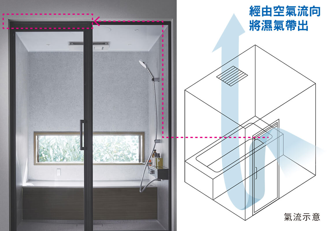 空氣透過門上框特殊氣流孔設計,將外面空氣由下至上,由暖風機/換氣扇吸出。室內牆面與地面溼氣不易殘留水氣,達到乾爽舒適。